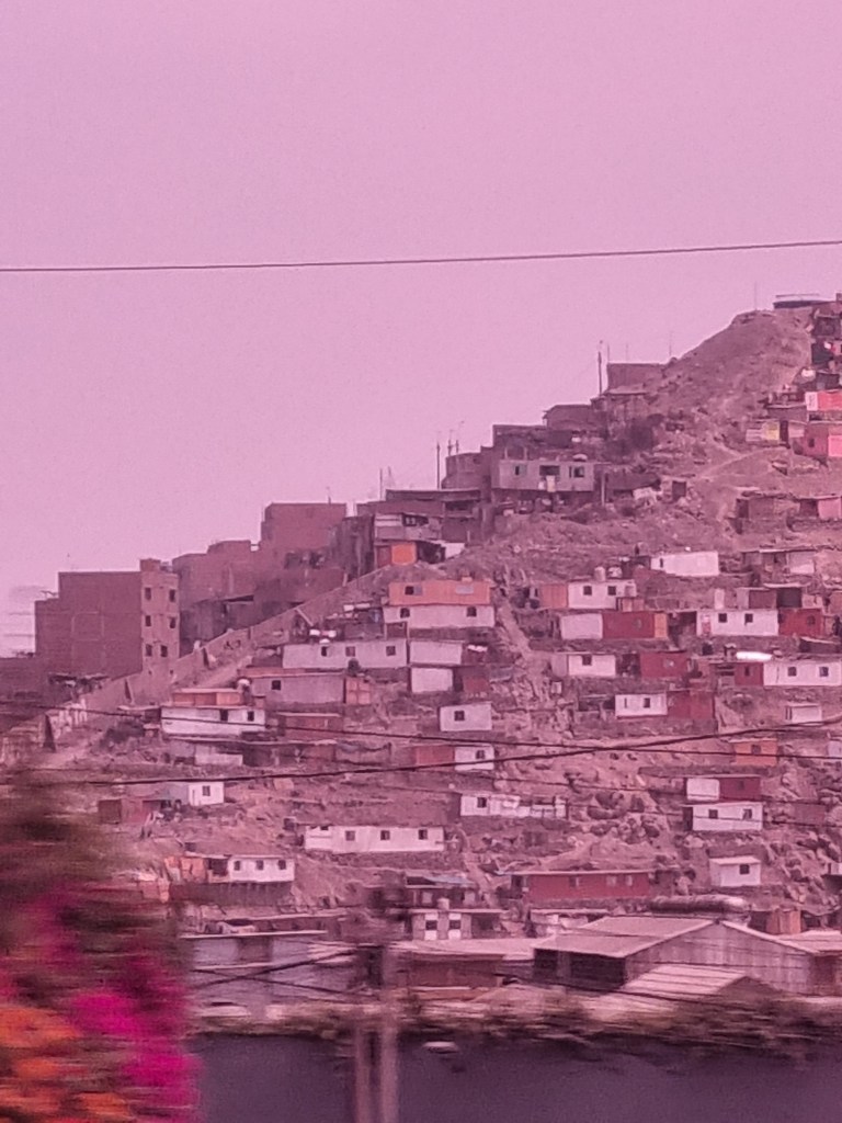 Fortunately the drive was also uneventful. One third (11 million people) of Peru’s population live in Lima – a city were it never rains! There is of course a lot of poverty. The roads were busy and typical of a lot of other big cities we have travelled in – there were 5 lanes of traffic on a 4 lane road! A lot of people try to make their living by selling items at stopped traffic. I was amazed at what was being offered – from food, drink and icecreams to electronic gadgets and toys and games!